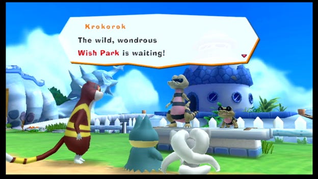 At this point, we overhear a crowd gathering around a pair of Pokémon, and we go to join them. Krokorok and Sandile are telling everyone about a special area called Wish Park, that is supposedly even more fun than the regular Poképark. We get intrigued, so we head on over to where they say the entrane is.