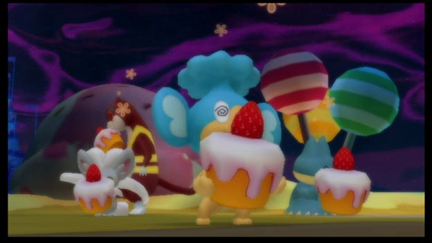 We emerge on the other side in a mysterious land floating in a purple void. Everything in our immediate vicinity is made out of desserts. An attendant greets us and directs us to the park’s attraction. We see that it is very addicting, as somebody at the entrance has played it 23 times in a row and already wants to go back for more. The attraction’s manager, Cofagrigus, brings us in and has us play.
