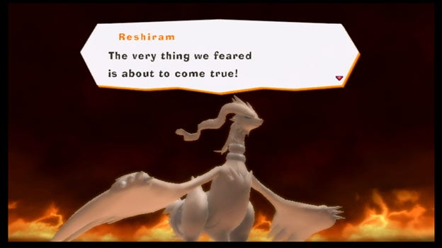 The first things we see once we start the game are two legendary Pokémon Zekrom and Reshiram. From their planes of thunder and fire, they discuss how the two worlds’ demise is imminent, but that they see a light of hope growing deep within the smothering darkness.